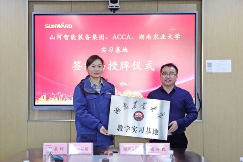 本网讯(商学院 陈志娟 石勇)10月20日下午,湖南农业大学、ACCA与山河智能装备集团实习基地签约及授牌仪式在山河智能总部大楼隆重举行。ACCA华南区总监袁哲女士,山河智能财务总监熊道广、人力资源部副部长郭美玲,我校商学院院长杨亦民、副院长莫鸣等出席。