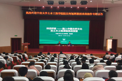 本网讯(水利与土木工程学院 李华欣 翟光辉)12月10日下午,中南大学土木工程学院院长何旭辉教授应邀作客我校学术科技节,在修业讲堂作题为《诗话桥梁——融入中国古桥文化的土木工程课程思政探索》专题报告。报告会由水利与土木工程学院院长王辉主持,学院班子成员和300余名师生代表聆听报告。