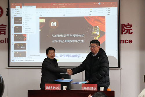 校企双方签订了合作协议,并举行了弘成智慧云平台及双创实验室授赠仪式。