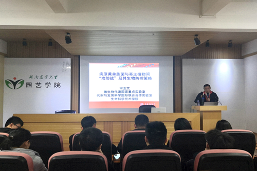 本网讯(园艺学院 龙新杰)12月16日下午,园艺学院举行第十九届研究生学术科技节名师讲坛暨第11期园艺讲坛,邀请上海交通大学教授何亚文作题为《病原黄单胞菌与寄主植物间“攻防战”及其生物防控策略》的学术报告。园艺学院百余名师生聆听报告,报告会由园艺学院副院长马先锋主持。