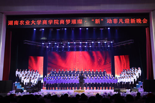 本网讯(商学院 邹亚 卢木子)为迎接新的一年到来,展现商院学子风采,“商梦璀璨,‘新’动非凡”迎新晚会于12月27日晚在学校大礼堂举行。校党委委员、宣传部部长、统战部长刘启定,学校创新创业教育中心、就业指导服务中心,学生工作部,团委负责人,商学院全体院领导以及教职工、学生代表观看晚会。