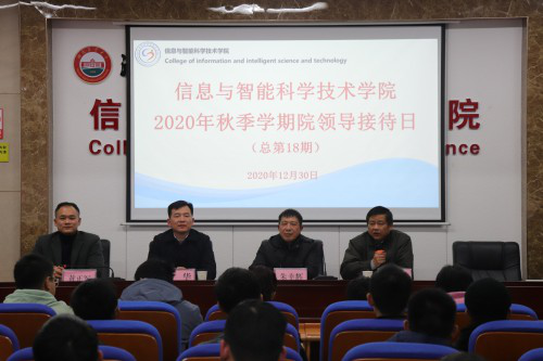 本网讯(信科学院 欧阳文弢 邹阳)为畅通院领导与师生的联系渠道,广泛听取师生对学院建设发展的意见和建议,解决学生在思想、学习、生活等方面的困惑,12月30日晚,信息与智能科学技术学院在十三教504举行2020年秋季学期“院领导接待日”。学院院长朱幸辉、院党委书记邵华、副院长张林峰、院党委副书记黄正军出席,辅导员和各年级学生代表参加。