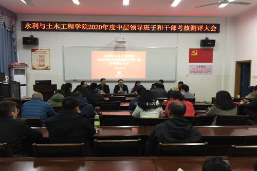 本网讯(水利与土木工程学院 翟光辉)2月26日上午,水利与土木工程学院召开全院教职工大会,进行2020年度中层领导班子及干部考核测评、布置2021年度重点工作。党委委员、副校长兰勇出席,学院全体教职工参加。
