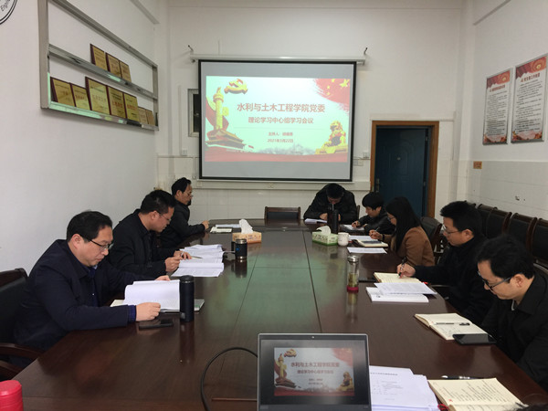 本网讯(水利与土木工程学院 翟光辉)3月23日上午,水利与土木工程学院召开党委理论学习中心组会议,开展党史学习教育第一次专题“学史明理”学习。学院党委书记胡德勇主持学习,学院党委理论学习中心组全体成员参加。