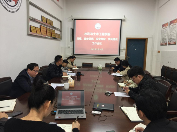 本网讯(水利与土木工程学院 翟光辉)3月29日上午,水利与土木工程学院党委在8教北105会议室举行2021年党建、宣传思想、安全稳定和作风建设工作会议。会议由学院党委书记胡德勇主持,学院领导班子成员、各系(办)、各党支部负责人和全体管理人员参加会议。