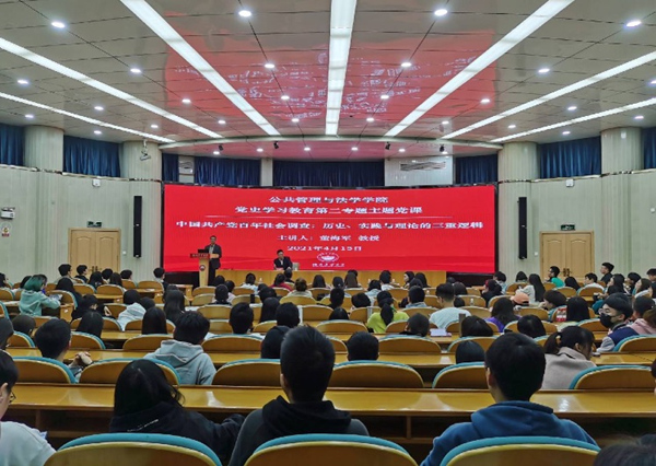 本网讯(公共管理与法学学院 夏威 施倩倩)4月15日晚,湖南农业大学公共管理与法学学院在生科楼国际会议厅召开党史学习教育第二专题主题党课。中南大学公共管理学院副院长、博士生导师董海军受邀作《中国共产党百年社会调查:历史、实践与理论的三重逻辑》的主题报告,学院党委书记莫华主持。