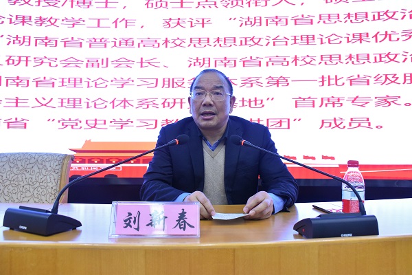 本网讯(风景园林与艺术设计学院 刘盈)4月15日下午,湖南省“党史学习教育宣讲团”成员、湖南省马克思主义研究会副会长、我校马克思主义学院教授刘新春在生科楼国际会议厅为风景园林与艺术设计学院和生物科学技术学院全体党员讲授党史学习“学史增信”专题党课。生物科学技术学院党委书记李晗飞主持。