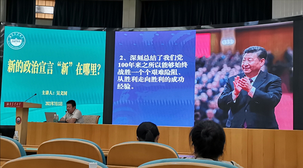 在重温建党百年庆典的精彩瞬间之后,吴义国以《新的政治宣言“新”在哪》为题,对习近平总书记在庆祝中国共产党成立100周年大会上的重要讲话作了全面系统的独到解读。吴义国认为,总书记的重要讲话,是百年大党坚守初心使命、担当民族复兴大任的伟大政治宣言,是立足中国共产党百年华诞的重大时刻和“两个一百年”历史交汇的关键节点新背景,是彰显伟大功绩的新“庄严宣告”,是对实现中华民族伟大复兴主题和四个阶段伟大成就的新概括,是对伟大建党精神的新提炼,特别是讲话中的“九个必须”,为全党全国各族人民向第二个百年奋斗目标迈进带来了新启示、指明了前进方向、提供了根本遵循。整场党课,吴义国以高度凝练的语言,引经据典,巧用毛泽东诗词,引用蔡和森、杨开慧、何叔衡等先烈感人至深的故事,辅以翔实的数据、鲜活的案例,给全体党员带来一场丰盛的思想盛宴。