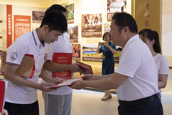 兰勇为水利与土木工程学院暑期“三下乡”乡村振兴实践团授旗,水利工程系主任吴友杰副教授接旗。