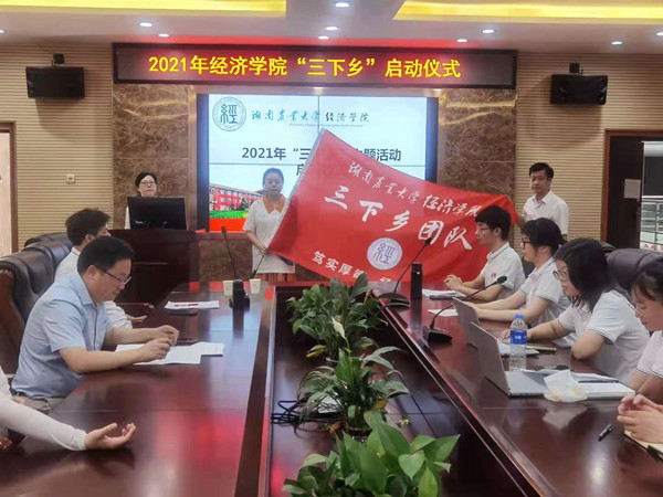吴峰分别为“三下乡”学生团队授旗。刘辉寄语团队成员们,要凝心聚力,共同完成团队活动;要服务乡村振兴,把论文写在大地上;要重视纪律,一切行动听指挥。同时,需要提高安全意识,做好疫情防控。