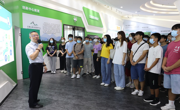 在王建龙教授的带领下,学生们首先参观了岳麓山种业创新中心(以下简称“中心”)。 中心常务副总经理刘志贤向全体学生介绍了中心成立背景、运营理念、专业研究中心、成果孵化转移中心、研发团队、技术优势以及首批专业研究成果和关键技术。学生们听完介绍后感触良多,深刻认识到种业作为农业的“芯片”,汇聚着最前沿的科技,有着基础性、战略型的地位。