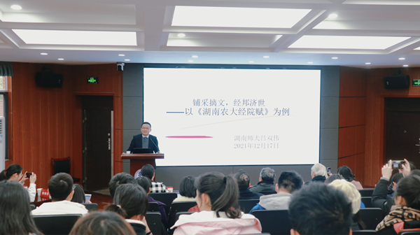 吕双伟介绍了经典赋举隅与赋体特征,解读了《湖南农大经院赋》并传授了写赋经验。吕双伟表示,文学修养可以扩大视野、提升境界、传递审美享受、传承优秀文化。他与经济学院师生共勉“好读书”,让读书成为个人的生活习惯。