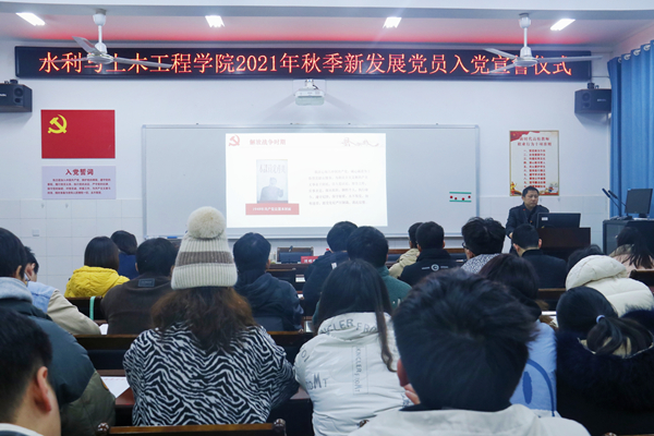 本网讯(水土学院 刘峻峰 邓澳)为坚定入党信念,永葆入党初心,12月31日下午,水利与土木工程学院在八教开展2021年秋季新发展党员入党宣誓仪式。