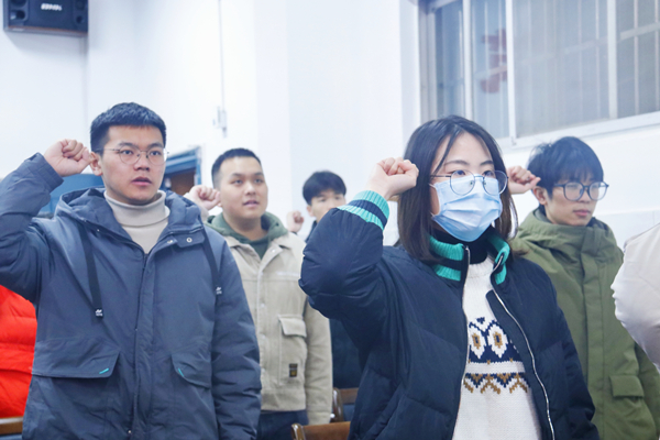 在“一言一语”展现青年担当环节,全体新党员庄严宣誓。2019级党员周炜智同学带领新发展党员宣读入党誓词。2019级新发展党员黄清说道:“入党宣誓后,意味着自己做出了一份庄严的承诺,这是对党的承诺,也是对自身的承诺,我们身上的责任更重了,在今后的言行举止中更要严格要求自己,以身作则,认真履行党员义务,不断学习,向先锋模范看齐,争做优秀共产党员!”