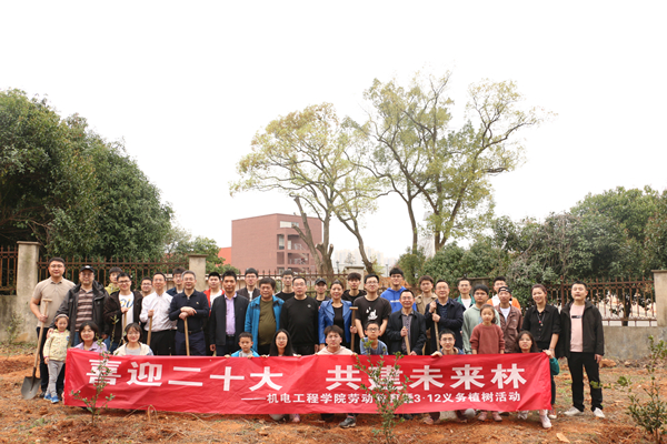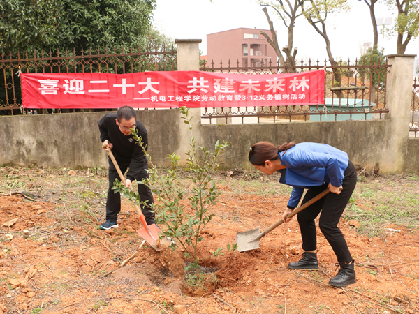 本网讯(机电工程学院 王勇乾)草长莺飞,春回大地。在第44个植树节到来之际,为积极响应学校劳动教育的号召,3月12日,机电工程学院以“喜迎二十大,共建未来林”为主题,在国家水田机械质量检验检测中心试验基地开展了劳动教育暨3·12义务植树活动。省农机事务中心相关领导,全体院领导、辅导员、党员代表、教师和学生代表参加。