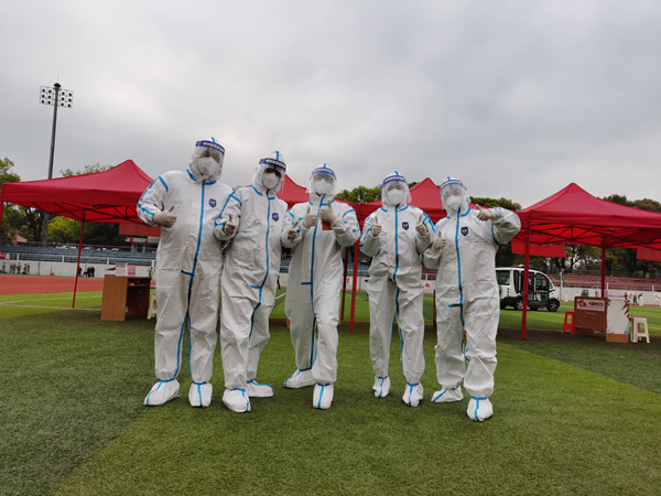 “这几个身着防护服的核酸检测工作人员是我们院的教师党员!真心为她们点赞。”学院王老师在学校组织的全员核酸检测现场拍下学院教师党员合影,并在学院教职工群里发了这样一条消息。