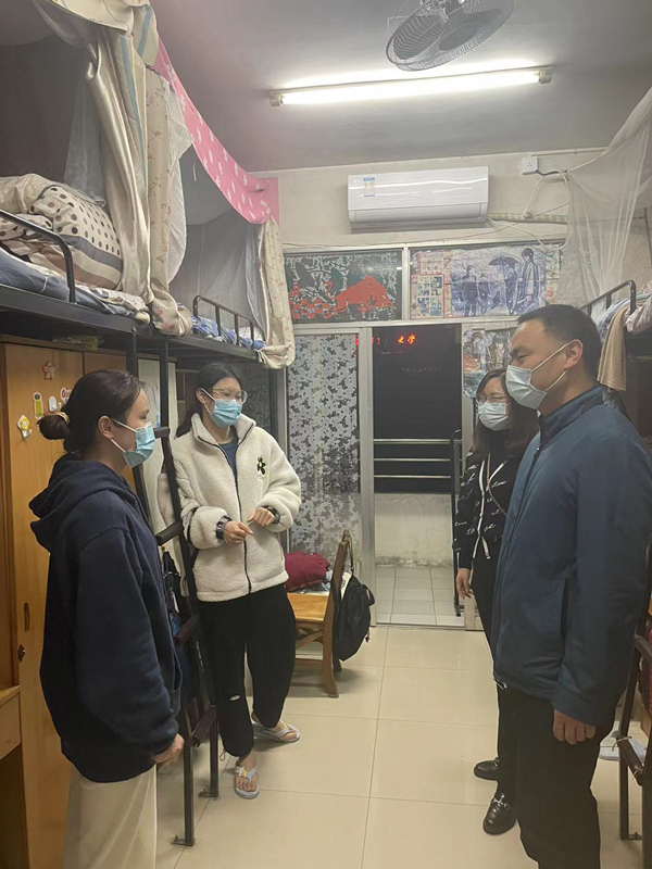 走访慰问过程中,各位老师与学生们亲切交谈互动,详细了解学生身体、生活和学习情况,耐心解答了同学们提出的问题。曹庆荣、王山群等鼓励同学们保持乐观积极的心态,加强体育锻炼和自我心理调适,高质量完成学习任务;嘱咐同学们进一步提高思想认识,紧绷疫情防控之弦,积极配合学校防疫措施,及时接种疫苗,在公共场所戴好口罩,注意自我日常防护,做到“非必要不流动、非必要不聚集、非必要不出校”,有困难找老师、找学院,学院永远都是同学们的“家”。并号召大家坚定信心,不造谣、不信谣、不传谣,齐心协力,共克时艰,坚决打赢校园疫情防控阻击战。