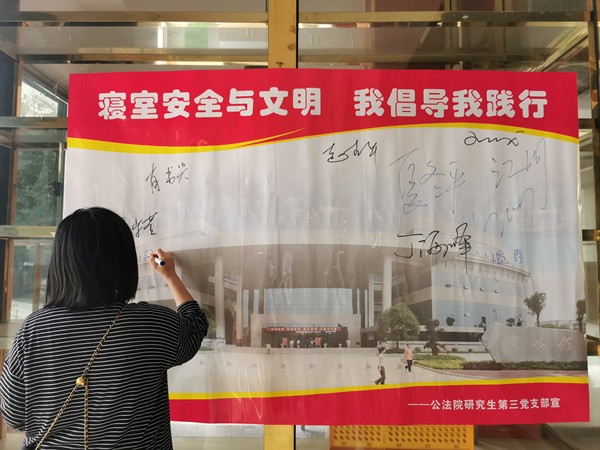 在“寝室安全与文明、我倡导我践行”签名活动现场,党员们庄重地签下自己的名字。活动也吸引其他学院博士生和留学生积极参与进来,纷纷在签名版上留言签名,表示会努力践行寝室安全与文明的倡议,塑造干净、文明、温馨、有爱的宿舍。