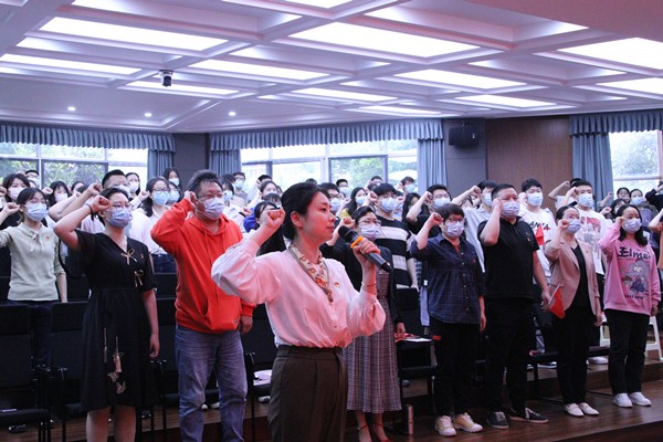 大会伊始,全体肃立、奏唱国歌,高洁带领全体党员庄严宣誓,曾建英、李苏英及各党支部书记为新发展党员佩戴党徽。