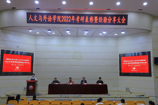 本网讯(人文与外语学院 田建湘 曾葵华)5月26日上午,人文与外语学院在大成厅举行2022届考研表彰暨经验分享大会。会议由副院长范丽群主持。学院党委书记莫华,副院长谭燕萍、史晓雷,各系部主任,辅导员,班主任以及2018级考研表彰学生和2019级全体学生参加。会议在庄严的国歌声中拉开帷幕,谭燕萍宣读考研表彰决定,授予周洋舟等46名同学"考研之星"荣誉称号,并颁发荣誉证书和纪念品。纪念品由学院精心设计和定制,是一只头戴学士帽、身穿学士服、手握录取通知书的考研上岸熊,并镶嵌有学院logo和考研之星刺绣,表达了学院对考研上岸同学的热烈祝贺和对下一届考研学生的美好祝愿。