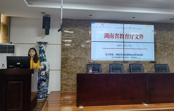 会上,副院长王华领学了《湖南省高校教师违反职业道德行为处理实施办法》原文,并以《立德树人铸师魂,不忘初心正师风》为题从师德师风德的内涵、内容、现状、养成及思考五个方面作主题发言。她指出,学院师德师风建设要强思想,系统开展师德师风教育;要强纪律,引导践行师德师风规范;要学“四史”,激发教师内生动力;要学楷模,传递榜样优良品格;要重实践,强化担当知行合一。