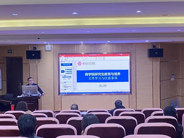 杨亦民结合研究生培养的不同阶段和目标解读了《湖南农业大学预防与处理学术不端行为实施办法》《湖南农业大学博士硕士论文抽检实施办法》,讲解了研究生课程学习及培养环节的重要时间节点,并要求全体导师和班主任实时跟进研究生培养进程;并就毕业要求及学位论文的写作、送审、抽检相关事项作详细说明,建议导师对标对表进行学位论文指导。