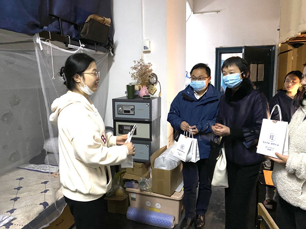 高洁亲切慰问考研学子,询问学生生活状况,鼓励大家放松心态。老师们逐间进到学生寝室,亲手送上助力考研定制礼包,每一份都寄托着对学生的真诚祝愿与希冀。礼包内含脐橙、糖果、暖宝宝:愿同学们“脐”开得胜,“橙”功上岸,奋力拼搏,终会苦尽甘来。