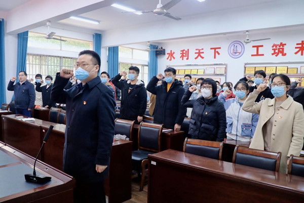 在鲜红的党旗下,胡德勇带领全体党员庄严宣誓,“我志愿加入中国共产党,拥护党的纲领,遵守党的章程……”铿锵誓言,表达了新时代共产党员的责任与担当,展现了水土学子良好的精神风貌、饱满的学习干劲和昂扬的青春斗志。