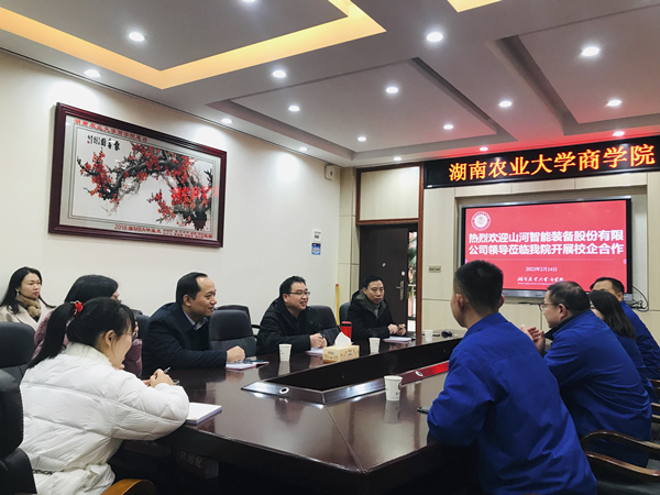 本网讯(商学院 廖翼)2月14日上午,山河智能装备股份有限公司人力资源总监肖伟等一行来商学院开展校企合作育人校招活动。商学院院长杨亦民、副院长莫鸣、副书记潘斌,市场营销系主任孙艳华、副主任廖翼以及教师代表刘异玲、张浪潮、张旖莹等参加座谈会。