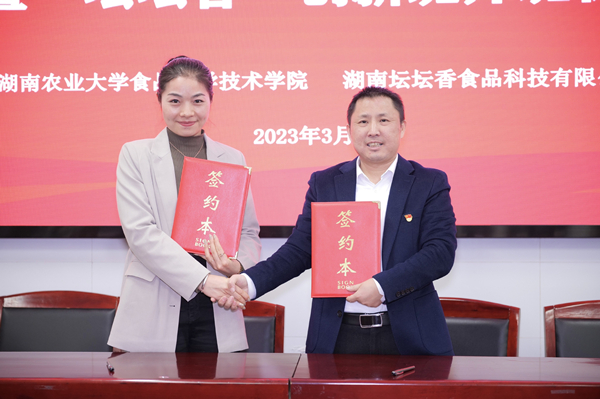 活动现场,学院党委书记刘峻峰和湖南坛坛香食品科技有限公司总裁办主任兼党支部书记刘芳签订《校企党建共联协议书》。张立为合作双方授予《校企党建共同体》牌匾。