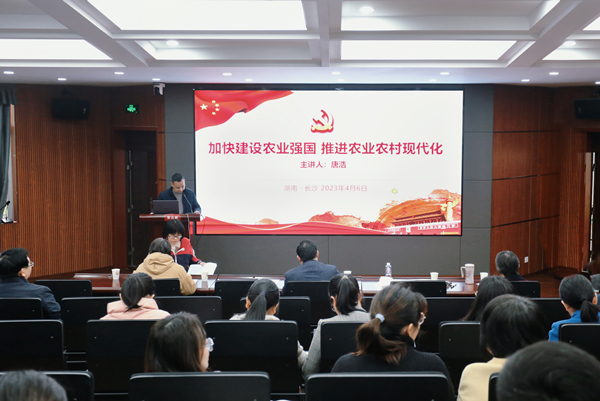 副院长唐浩以“加快建设农业强国,推进农业农村现代化”为题,结合专业知识从锚定建设农业强国目标,切实抓好农业农村工作、保障粮食和重要农产品稳定安全供给始终是建设农业强国的头等大事、全面推进乡村振兴是新时代建设农业强国的重要任务、依靠科技和改革双轮驱动加快建设农业强国、大力推进农村现代化建设以及加强党对加快建设农业强国的全面领导六个方面进行授课。