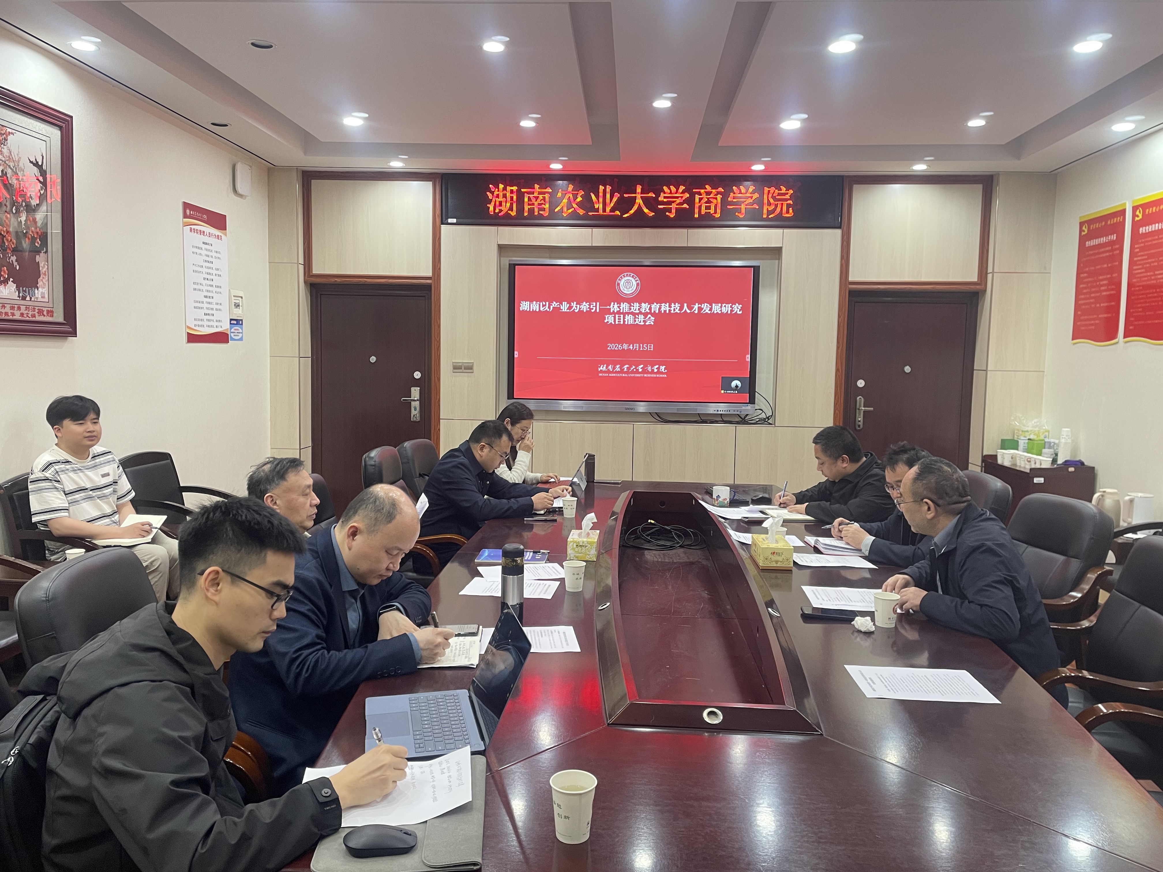 本网讯(商学院 翦润芳)4月15日,商学院召开“湖南以产业为牵引一体推进教育科技人才发展”省社科重大项目推进会,旨在扎实推进项目研究各项工作落地见效。社会科学处处长匡远配、商学院副院长唐文源、国家社科重大项目首席专家罗光强及课题研究团队成员参加,商学院院长杨亦民主持。