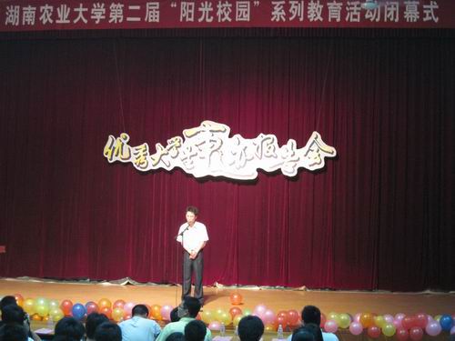 接着,校学生工作部欧阳长安副部长宣读了《关于表彰第二届“阳光校园”系列教育活动优秀学院和个人的决定》,其中,商学院杨偲同学获得“诚信、励志、感恩”主题征文一等奖,东方科技学院冉小庆等2名同学获得二等奖,食品科技学院秦波等4名同学获得三等奖;科学技术师范学院2008级英语教育班获得“诚信事件”征集优秀班级一等奖,资源环境学院2008级土管1班等2个班级二等奖,园艺园林学院2007级园林1班等3个班级获得三等奖;经济学院金岸4栋624等2个宿舍获得“爱心宿舍”优秀寝室一等奖,体育艺术学院丰泽6栋北505等4个宿舍获得二等奖,理学院东湖5栋243等6个宿舍获得三等奖;外国语学院等5个学院获得第二届“阳光校园”系列教育活动优秀组织奖。