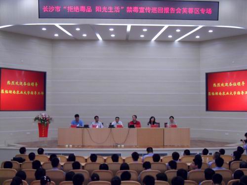 6月19日下午,由长沙市禁毒办与芙蓉区禁毒委共同主办的长沙市“拒绝毒品•阳光生活”禁毒宣传巡回报告会芙蓉区专场在我校图书馆大成厅举行。校党委副书记彭克勤教授、校长助理张立教授,芙蓉区人民政府副区长刘熙宇、长沙市禁毒办副主任、长沙市公安局禁毒支队政委彭迟平、长沙市禁毒办副主任欧建平出席了本次报告会。