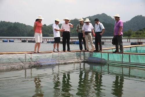 刘强书记一行在二坊坪乡大水面网箱鳡鱼养殖场考察