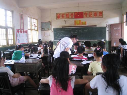 国际学院“三下乡”的队员在支教中给当地中小学生上英语课