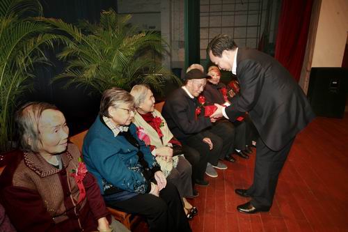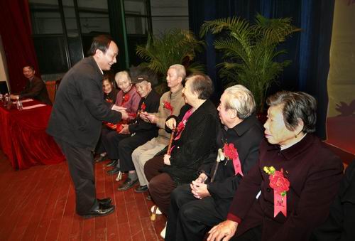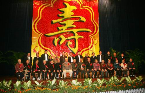 10月15日下午,我校2010年重阳节祝寿大会在大礼堂举行。校领导刘强、周清明、彭克勤、周仲文、王湘、齐绍武,校长助理张立及各院、部、处主要负责人与老同志们欢聚一堂,为今年年满八十、九十周岁的离退休老同志集体祝寿。今年我校年满80周岁的老寿星31位,年满90周岁的老寿星1位。