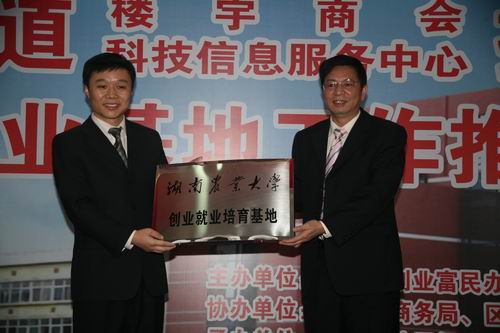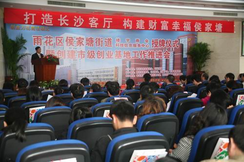 会上,侯家塘街道工委书记刘江红发表了致辞。他在致辞中说,就业是民生之本、创业是发展之源;创办侯家塘创业富民基地,吸引高校、科研院所、楼宇商会参加,共同为大学生打造一个好的创业平台,让大学生能够在新的舞台上创造人生新辉煌。接着,大学生创业项目进行了多媒体展示,创业学生代表、中南大学在读博士杨意同学作了创业感言的演讲。会上还进行了大学生创业基地授牌仪式,陈冬林副校长向侯家塘街道授予了“湖南农业大学大学生创业就业培育基地”牌匾。
