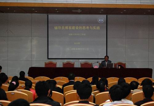 10月21日下午,我校2010年学生工作系统业务培训之“辅导员博客建设的思考与实践”专题报告在八教学楼学海厅顺利举行,担任主讲的是湖南大学学工部副部长彭文军副教授。培训由校学工部部长刘启定主持。