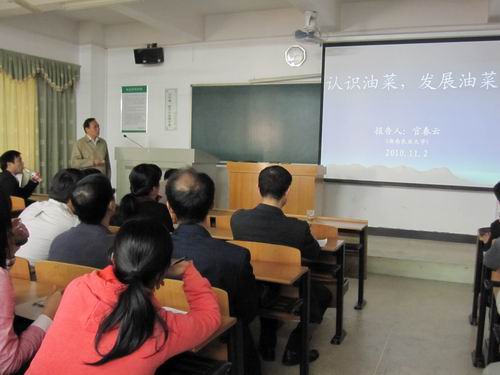 官春云院士作了题为“认识油菜,发展油菜”的报告。他介绍了油菜的用途,阐明了油菜生产存在的问题,发展油菜的措施,油菜加工技术及油菜的生长发育规律。