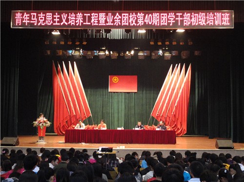 为全面贯彻十七届五中全会精神,创建学习型团学组织,争当学习型团学干部,11月13日—14日,我校青年马克思培养工程暨业余团校第40期团学干部初级培训班在大礼堂隆重举行。培训班为期两天。校学生会、校学社联、校团刊编辑部及网络部、校纠察队以及19个学院共877名基层团学干部代表参加了本次培训。