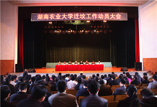 为加快长沙市文明城市建设步伐,推进东岸区域城市化进程,加快我校的建设发展,12月10日,芙蓉区委、区政府和学校党委、行政共同组织召开了湖南农业大学迁坟工作动员大会。芙蓉区副区长彭再魁,副调研员李宇安、贺岱权,区国土分局局长陈志敏,区民政局副局长陈同洲,东岸乡政府副乡长陈高峰等芙蓉区政府相关部门领导,在校校领导,全校副科级以上干部,机关处室、各学院教职工代表500多人参加了本次动员大会。会议由校党委副书记彭克勤主持。