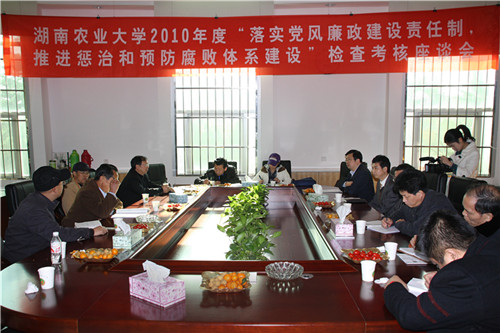 测评结束后,包括2名离退休同志在内的1 2名教职工代表在生命科学楼105会议室参加了检查考核座谈会。会议由省教育纪工委考核组组长李尚益主持。教职工代表结合各个学院或部门的实际情况,对我校在党政公开、人事招考、招投标、年终分配等各方面的廉政建设和反腐败工作作了客观全面的评价和总结。同时,考核组在生命科学楼二楼接待室详细查阅了我校关于党风廉政建设和反腐败工作的原始资料和相关文件。随后,考核组对我校落实党风廉政建设责任制,推进惩治和预防腐败体系建设的情况进行了反馈。