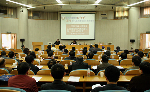 周清明校长作了题为“强化党风廉政建设责任制,着力推进惩防体系建设,促进学校又好又快发展”的汇报