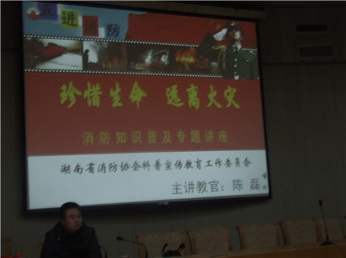 在以“珍惜生命、远离火灾”为题的讲座中,陈磊教官通过一件件触目惊心的典型火灾案例,讲解了发生火灾的主要原因、火灾形成的过程、火场中易出现的延误逃生时机的误区、自救逃生的方法等一系列防火知识。同时还示范了防毒面具和灭火器的使用方法,详细讲述了灭火器的类型、适用范围等。