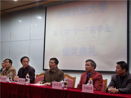 12月10日下午,第七届“守一”奖颁奖典礼在学海厅举行。原湖南省人大常委、中国农工党湖南省委原专职副主委、省政府参事、我校校友戴君惕教授来校颁发“守一”奖学金。此次受奖的分别是农学院2008级农学二班罗宁、园艺园林学院2009级园艺一班周游和食品科技学院2007级食品科学与工程一班黄璜等三位同学。