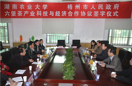 吴浩岭副市长表示,在今年3月举办的广西(梧州)春茶节暨六堡茶博览交易会茶产业发展论坛上,我校刘仲华教授作了主旨报告,给广西梧州人民留下了深刻印象。梧州市人民政府和社会各界希望与刘仲华教授等茶学专家开展深入合作,为六堡茶功能成分利用以及产业战略定位提供技术支持和指导,推动六堡茶产业向着茶饮料、茶食品乃至茶叶功能物的提取和应用等产业链延长,开辟更大市场,树立更响品牌。