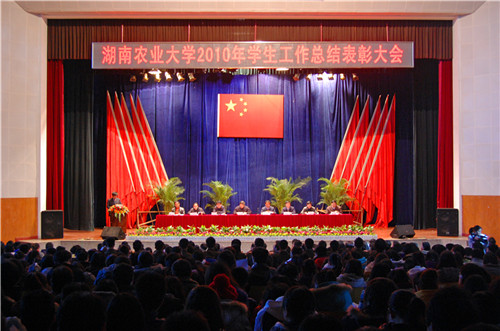12月30日下午,湖南农业大学2010年学生工作总结表彰大会在校大礼堂隆重举行。出席大会的校领导有校党委书记刘强,校党委副书记彭克勤,副校长符少辉、曾福生、陈冬林,纪委书记周仲文,副校长王湘,副校级督导员易自力。校友办、关工委、招生就业处、团委负责人,学工部全体人员,各学院分管学生工作的副书记、辅导员,校院学生会、校社团联合会、校纠察队部长以上干部,各班班长、团支部书记,各学院获奖学生代表参加了会议。大会由陈冬林副校长主持。