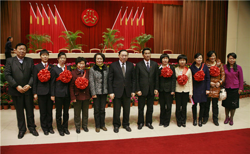 出席湖南省庆“三八”暨优秀女共产党员先进事迹报告会的省领导与代表们合影
