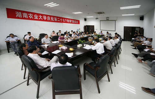 9月9日下午,以“忠诚党的教育事业,落实《教育规划纲要》”为主题的教师代表座谈会在图书馆124会议室举行。副校长符少辉主持会议。中国工程院院士官春云,校党委书记刘强、校长周清明等校领导,2011年荣获国家级、省级、校级教学名师、优秀教师、优秀教育工作者荣誉称号的教师,博士点或硕士点领衔人代表或教师代表,相关职能部门负责人参加了座谈会。